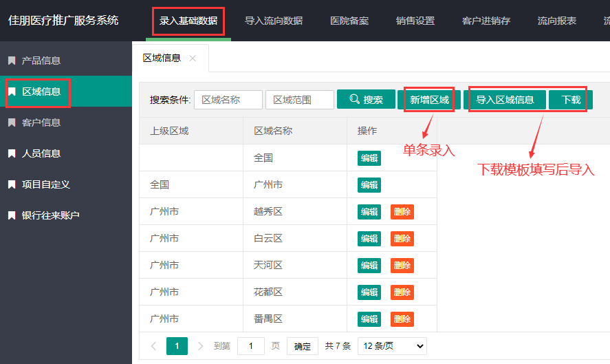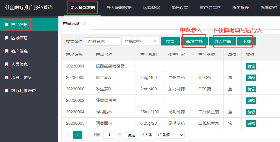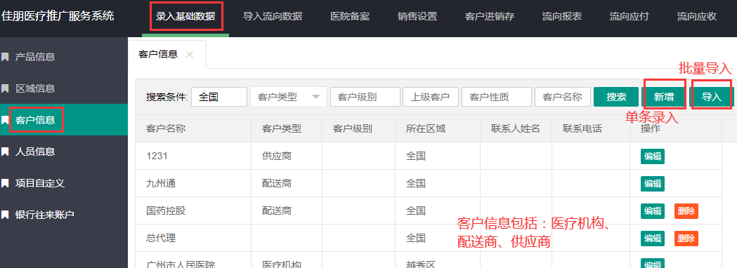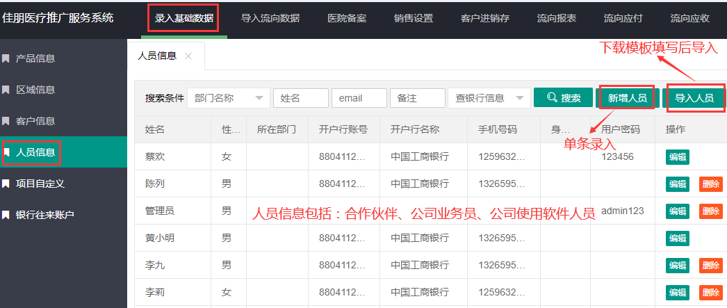 首次使用本软件,需要导入基础数据,基础数据分别有:产品信息、区域信息、客户信息、人员信息。