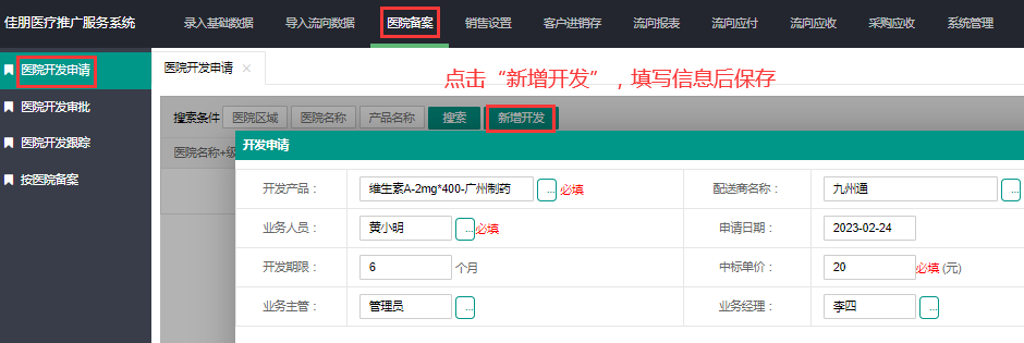 业务员(合作伙伴)可以在系统操作医院开发申请;