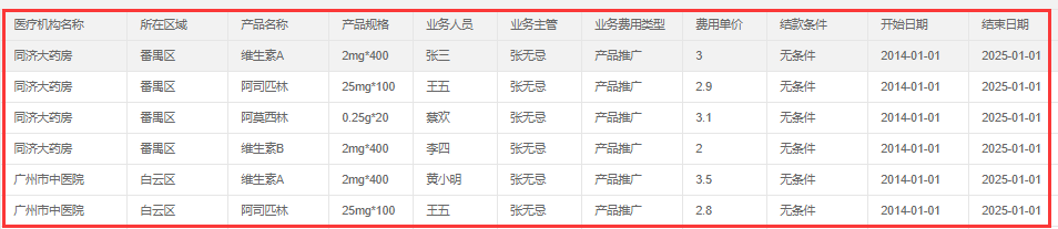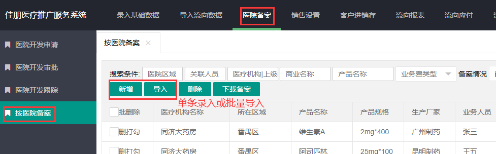 医院备案是设置具体某个业务员(合作伙伴)负责某个医院的某个产品,以及在该负责销售期限的费用提成单价和结算方式; 可以通过下载模板导入,或者单条录入。