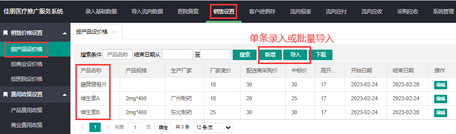 可以从三个维度设置销售价格:按产品、按商业、按医院;流向关联获取销售价格的顺序是:如果按医院有设置价格,则取按医院设置的价格,否则按商业取,如果没有按商业设置价格,则按产品取销售价格;