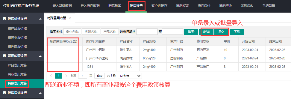 可以从三个维度设置费用政策:按产品、按商业、按特殊费用;流向关联获取费用政策的顺序是:如果存在特殊费用政策,