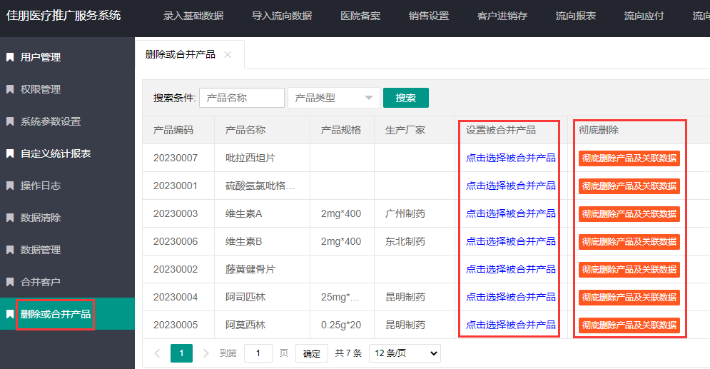 当存在一个产品,录入了两个名字,通过合并,会删除被合并的产品名字,然后数据归集到一个产品名字;通过“彻底删除”,