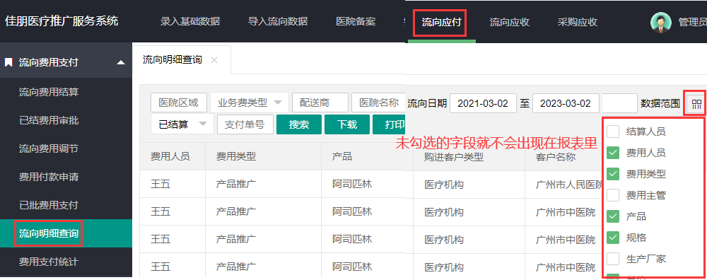打开“流向应付”里的菜单“流向明细查询”,点击“筛选列”,根据需要勾选字段名字。